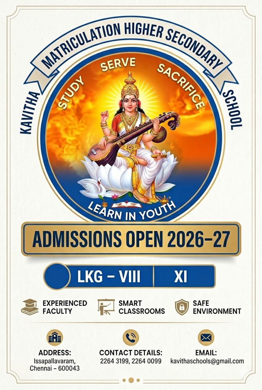 Read More“Kavitha English School” was named after the Goddess “Saraswathy’ the embodiment of Education and owes its birth on 1st June 1982 in order to impart true education blended with moral and ethical values. The school is run by “Kavitha Educatoinal & Charitable Trust” C. Pallavaram, Chennai – 600 043, as registered body under the Indian Trust Acts.